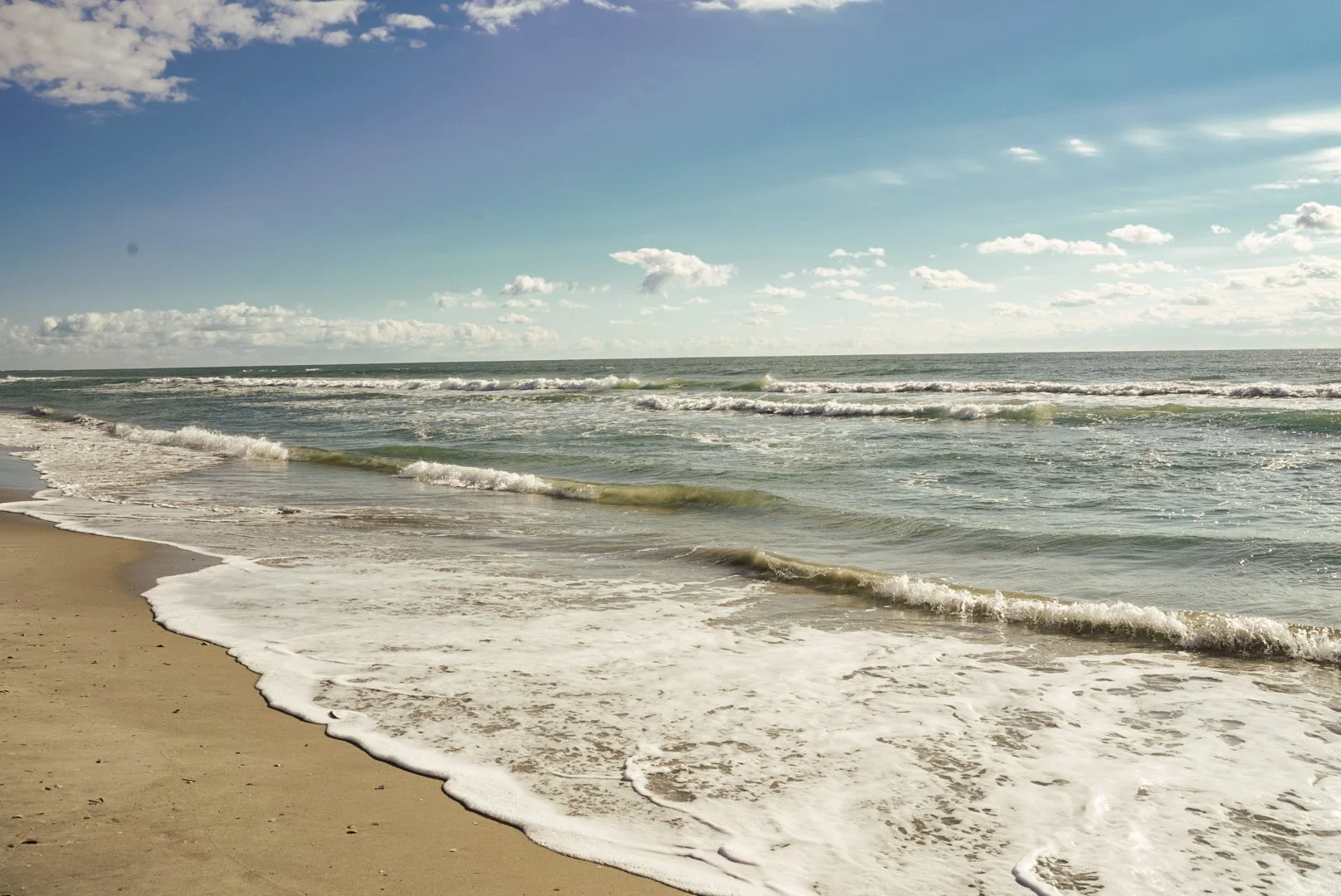 Sandy beach with tall grass and ocean waves under a partly cloudy sky.